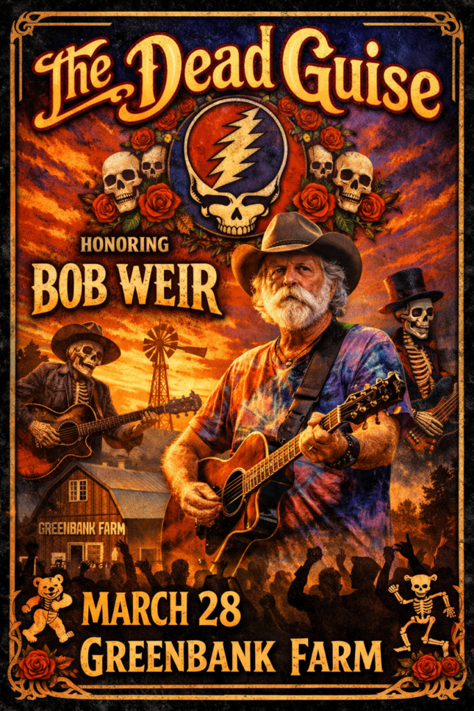 Bust out your tie dye and dance your skeleton off to Whidbey’s own Grateful Dead tribute band – The Dead Guise Band will be playing Greenbank Farm on March 28, 2026.